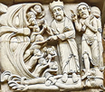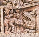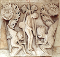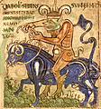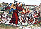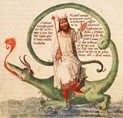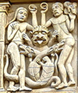 "Teufel auf Behemoth" im Liber Floribus des Lambert von Saint-Omer. Hängung des Judas, Cathedral of St. Lazare in Autun, France. Erzengel Michael mit dem Anthropophage (Menschenfresser) Manticor, einem Fabelwesen mit Löwenkörper, Menschengesicht und Skorpionschwanz. |