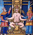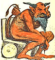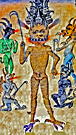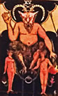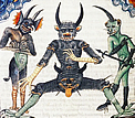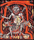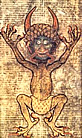 . Baphomet, Dämon mit gehörntem Ziegenkopf, feurigen Augen, weiblichen Brüsten und einem Pentagramm auf der Stirn, eine angeblich von den Tempelrittern verehrte Figur heidnischen Ursprungs. Höllenstrafen von Vincent de Bauvais. Höllenqualen am Fries der Kathedrale von Lincoln, England 1141. Teufel im Codex Gigas vom Kloster von Polaschitz in Böhmen. |
