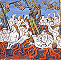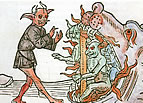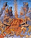 Jüngstes Gericht von Taddeo di Bartolo im Dom von San Gimignano. "Les Très riches heures du Duc de Berry" ist ein illustriertes Stundenbuch von 208 Blättern. Auf em Blatt "Die Hölle" von Pol de Limbourg röstet Luzifer im scharfen Kontrast zu Szenen des täglichen Lebens auf einem Riesengrill hilflose Verdammte, während nackte Seelen in seinen offenen Mund strömen. Inferno von Giovanni da Modena. |