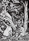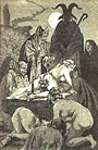 Chimären vom Architekten Eugène Viollet-le-Duc an der Kathedrale Notre-Dame de Paris. Tobiassegen gegen Hagel, Donner, Blitz, Feuer, Hochwasser, Tod und Diebstahl. Um 1850 "Die Hexenjagd" von Leon Ferris. |