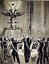 | Wiener Freimaurerloge "Zur gekrönten Hoffnung", der auch W.A. Mozart angehörte. Kupferstich eines Freimaurer-Initiationsritus des Meisters |