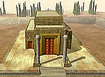 Im Auftrag von König Salomon (hebr. שלמה, Schəlom:o), dem Sohn Davids, errichten die Phönizier unter Anleitung von Baumeister Hiram Abif auf dem Tempelberg Zion in Jerusalem in sieben Jahren den ersten fest gebauten Tempel Israels. Er misst eine Länge von 60, eine Breite von 20 und eine Höhe von 30 Ellen. Zur Aufbewahrung der Schätze ist er an 3 Seiten von dreistöckigen Räumen umgeben. Das Innere des Tempels besteht aus einem Vorderraum, dem Heiligen, in dem der Räucheraltar steht, und aus einem durch eine hölzerne Zwischenwand davon getrennten Hinterraum, dem Allerheiligsten mit der Bundeslade, in der die Steintafeln Moses mit den 10 Geboten aufbewahrt werden. Dieses innerste Sanktum stellt die Bauchhöhle von Aschtoreth dar. Die linke Säule heißt „Boa“ (Urgroßvater Davids), die rechte „Jachin“ („er wird gründen“), ihre Kapitelle sind mit goldenen Granatäpfeln verziert (Symbol der männlichen Fruchtbarkeit). Der ganze Tempel ist mit Gold überzogen. Vor dem Eingang befindet sich der große Hauptaltar für die Brandopfer sowie das "Eherne Meer", ein aus Bronze gegossenes rundes Wasserbecken. Als 586 v. Chr. der Tempel durch Nebukadnezar II. zerstört wird, errichten die Juden nach ihrer Rückkehr aus der Babylonischen Gefangenschaft an gleicher Stelle einen neuen Tempel. |
