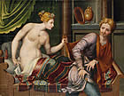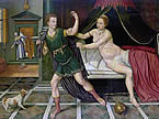 | Von Papst Clemens VII. beauftragt, malt Michelangelo von 1536 bis 1541 das Altarfresko „Des Jüngsten Gerichtes“ in der Sixtinischen Kapelle, von dem Marcello Venusti 1549 auch eine Kopie anfertigt. Nachdem am Konzil von Trient das Gemälde Michelangelos als amoralisch und obszön bezeichnet wird, bekommt unmittelbar nach dessen Tod im Jahre 1564 der Maler Daniele da Volterra von Papst Pius IV. den Auftrag, die anstößigen Blößen zu übermalen, was ihm den Spottnamen Braghettone („Hosenmaler“) einträgt. | 1564 | ![]() |