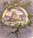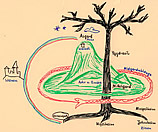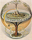 | Nordisch-germanische Mythologie: Nachdem die Götter den Ur-Riseb Ymir getötet haben, erschaffen sie aus seinem Leichnam alle existierenden Dinge. Die immergrüne Weltenesche Yggdrasil ist der erste, der größte und prächtigste Baum, der den gesamten Kosmos verkörpert. Er stellt die Verbindung zwischen den 3 Bereichen der Natur: dem Himmel, der Erde und der Unterwelt dar. Das Geäst der Oberwelt (Asgard) ist die Heimat des Göttervaters mit dem Göttergeschlecht der Asen und Wanen. Die Erde (Midgard) ist die Heimat der Menschen mit dem Wohnort des ersten Menschenpaares Ask und Embla. Umschlungen wird Midhgard von der Weltenschlange, die sich selbst verschlingt. Ein Ozean umgibt schließlich alles. Yggdrasil hat drei große Wurzeln, von denen Jötunheim das Land der Riesen mit dem Urdbrunnen beheimnatet, wo die drei Nornen Urd, Werdandi und Skuld residieren und das Schicksal der Menschen bestimmen. Die zweite Wurzel führt nach Niflheim, dem Reich des Eises, wo der Drache Nidhöggr haust, sowie ins Totenreich Hel unter der Regentschaft der Göttin Hel, der Tochter des Loki. Die dritte Wurzel, die Schwarzalbenwelt, ist die Heimat der Zwerge. Das Eichhörnchen Ratatöskr klettert immer zwischen der Baumkrone und Wurzeln hin und her und verbreitet die Nachrichten. | ![]() |